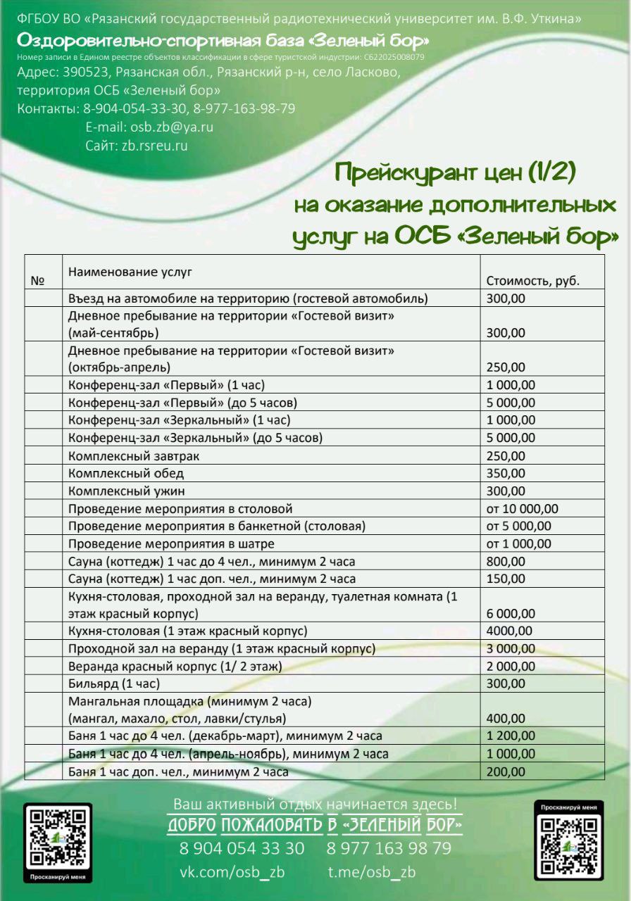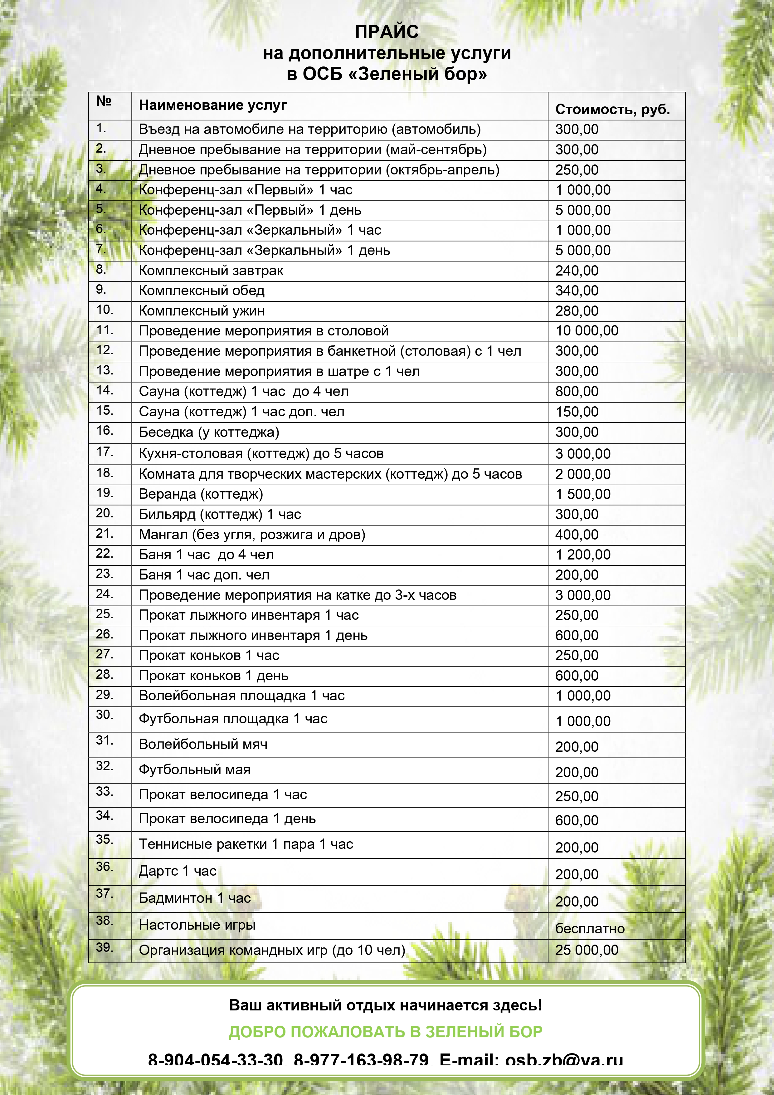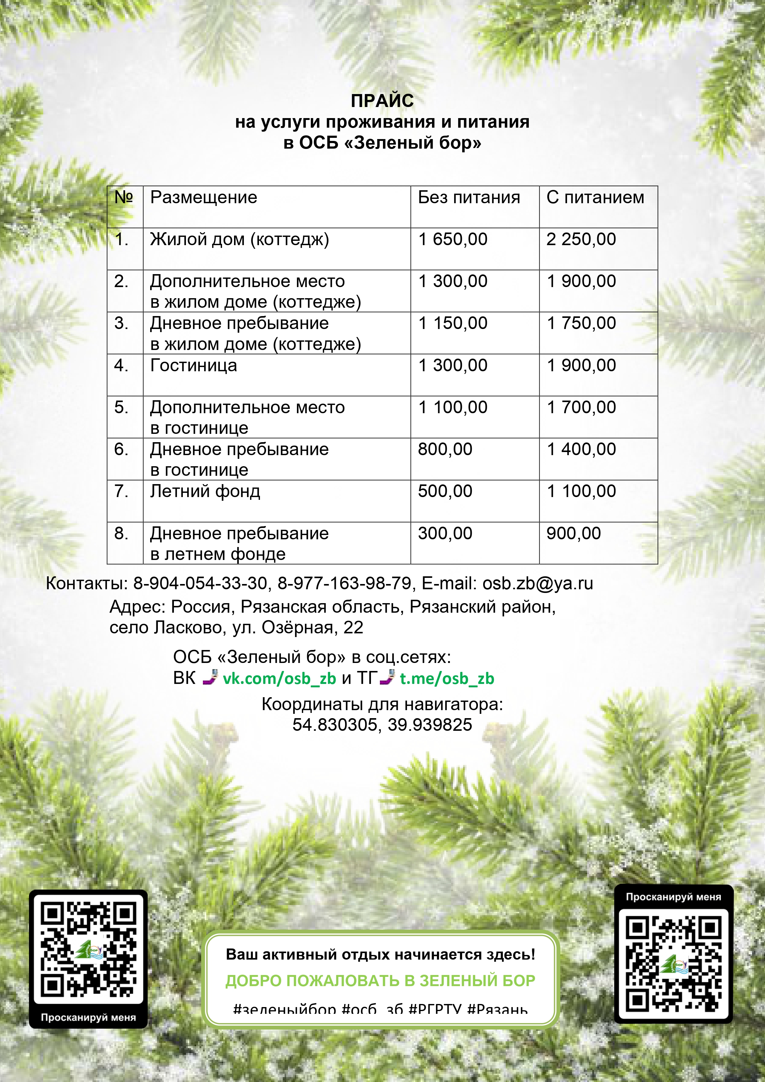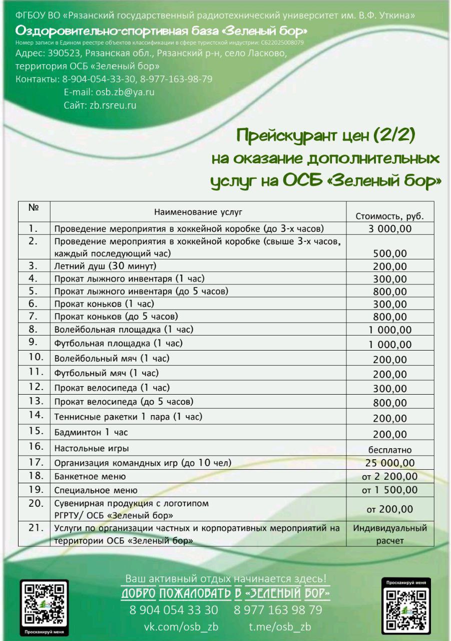 Оздоровительно - спортивная база «Зеленый бор», занимающая площадь около 6 га, располагает 12 домиками летнего типа на 4 места каждый. ОСБ «Зеленый бор» введен в круглогодичную эксплуатацию. Для отдыхающих представлены 19 комфортабельных двухместных номеров с дополнительным спальным местом (кресло-кровать),